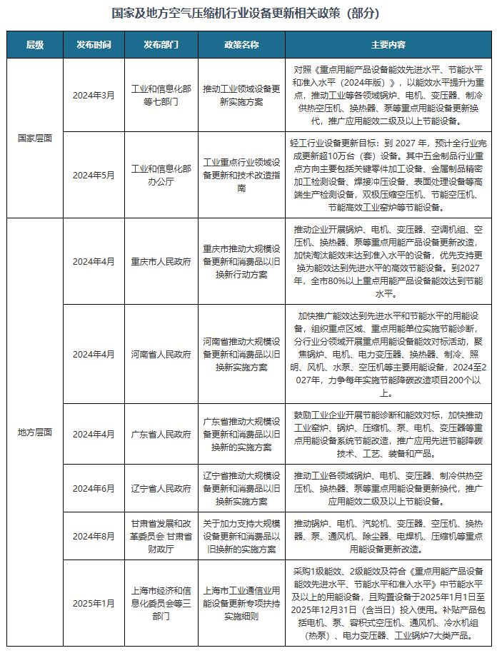 与此同时,日益肃穆的能效圭臬与装备更新战略也为气氛压缩机行业开展创建了新的机会。一方面,节能型气氛压缩机依据低能耗、高环保的上风,加快代替古板高耗能装备,市集排泄率延续上升;另一方面,邦度及地方战略促使中心用能装备更新,为节能型气氛压缩机开发市集空间。比如,2024年3月工业和讯息化部等七部分颁布的《促使工业周围装备更新履行计划》鲜明提出比较《中心用能产物装备能效先辈水准、节能水准和准入水准(2024年版)》,以能效水准提拔为中心,促使工业等各周围汽锅、电机、变压器、制冷供热空压机、换热器、泵等中心用能装备更新换代,扩充使用能效二级及以上节能装备。